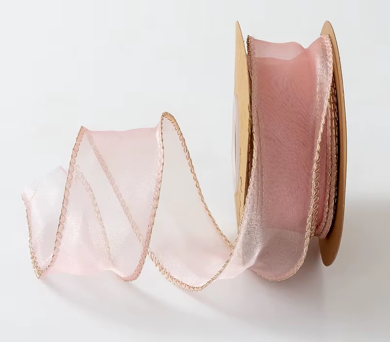 Лента декоративная из органзы "Локон с золотом", 40мм*10ярд (цвет нежно-розовый)